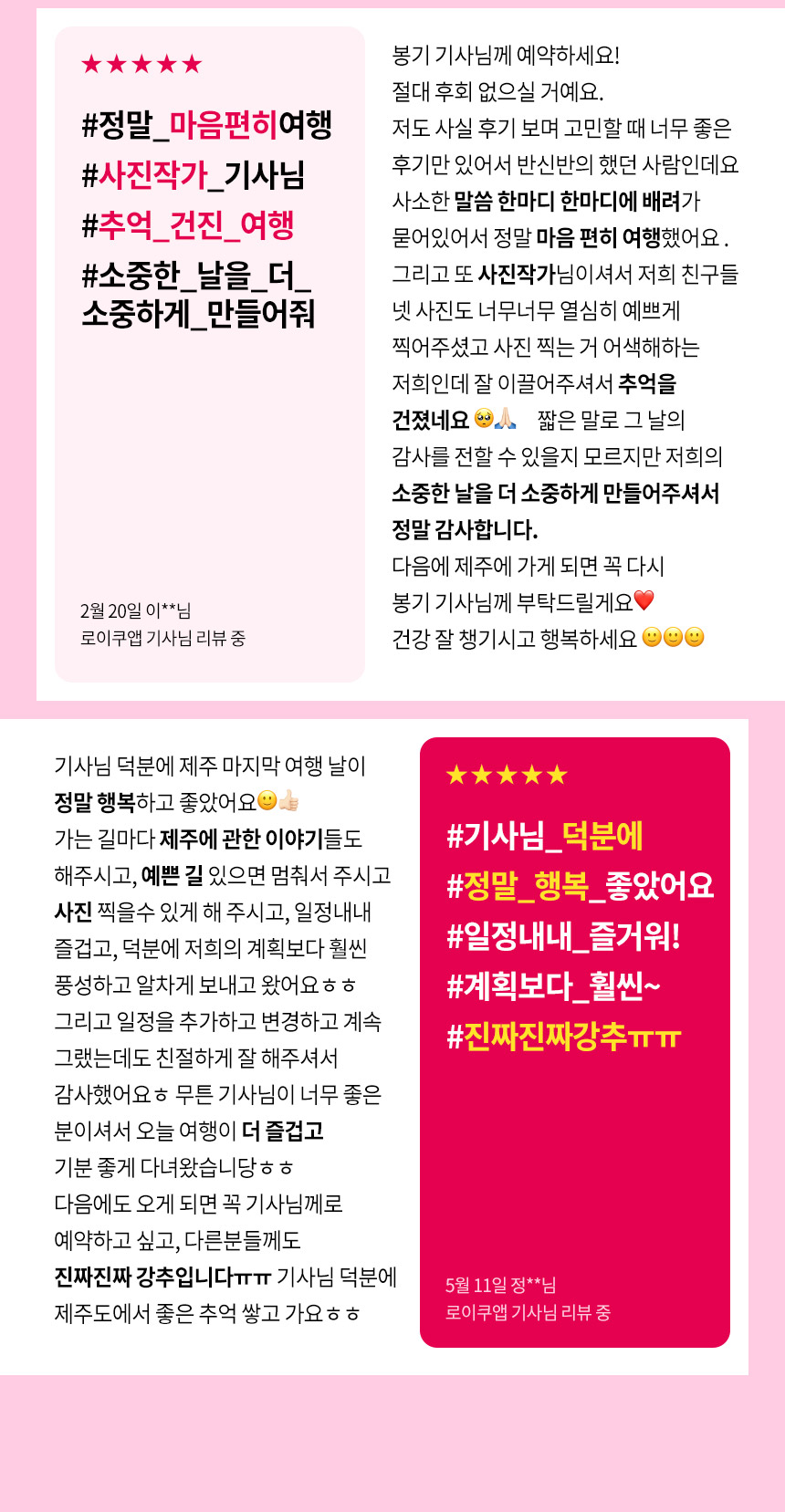Les chauffeurs vétérans de LOYQU sont des professionnels formés au taxi touristique — à la fois chaleureux et fins connaisseurs des destinations. Même si votre programme change selon la météo, vous profiterez de leurs recommandations. Les frais de service chauffeur sont inclus avec LOYQU : pas d’inquiétude pour les pourboires ou les repas. Quel que soit le chauffeur, votre voyage sera satisfaisant.